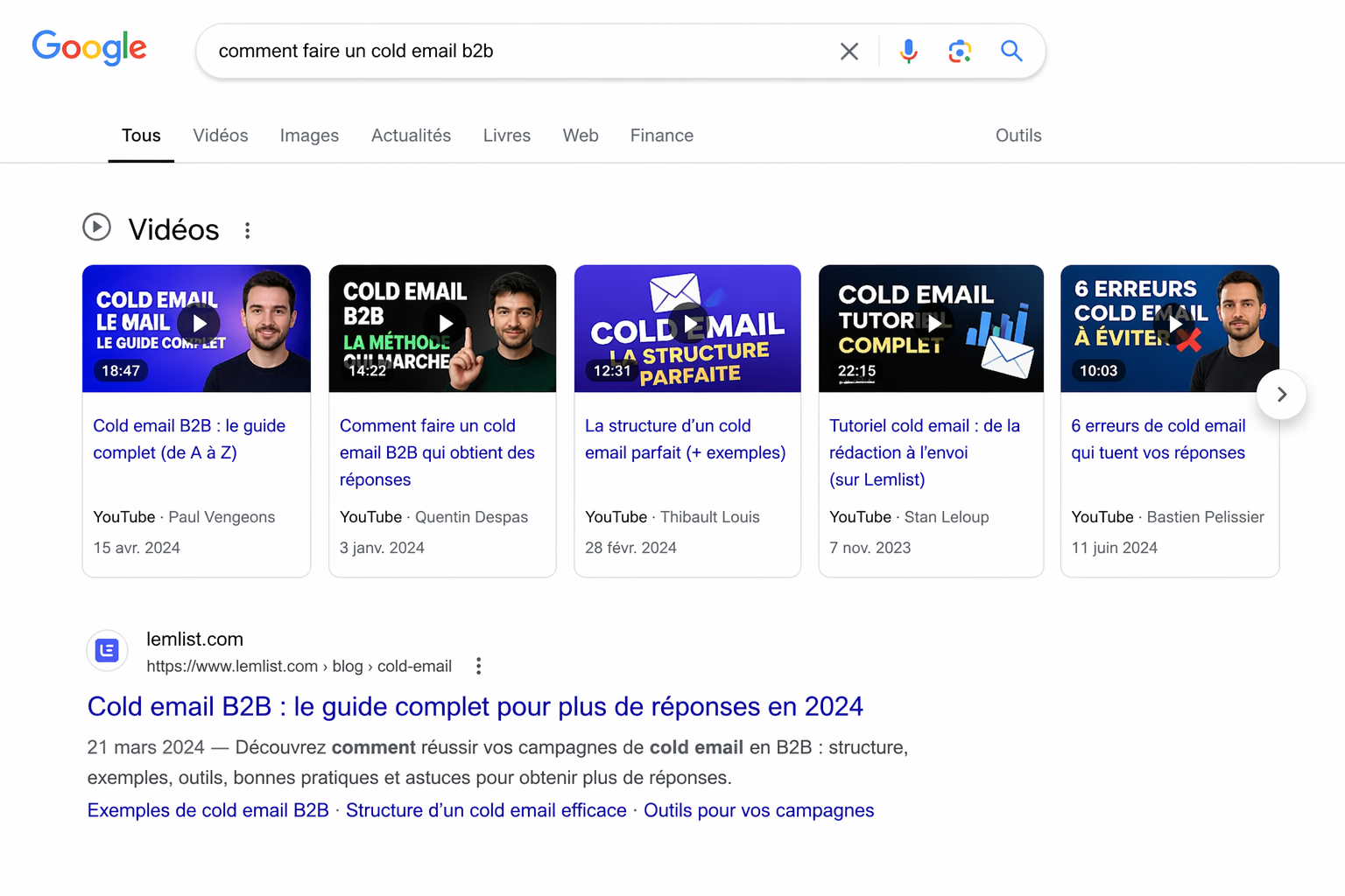 Ce que vos prospects tapent sur YouTube, ils le tapent aussi sur Google. Et Google affiche de plus en plus de vidéos YouTube dans ses résultats organiques , notamment sur les requêtes informationnelles et "how-to".